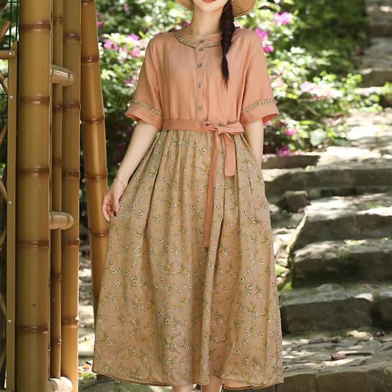Bomull Linne Sommar Blommig Patchwork Klänning