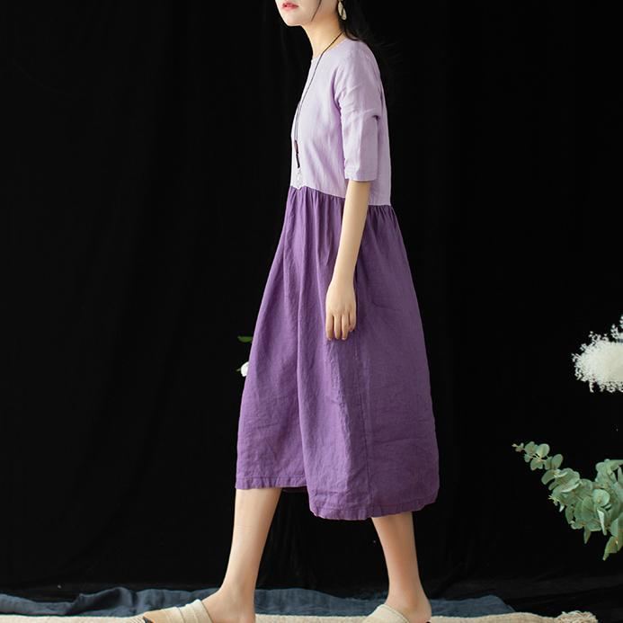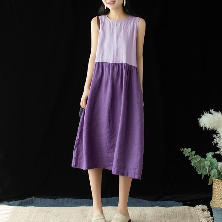 Kvinnor Bomull Linne Rund Hals Casual Paneled Midi Ärmlös Klänning