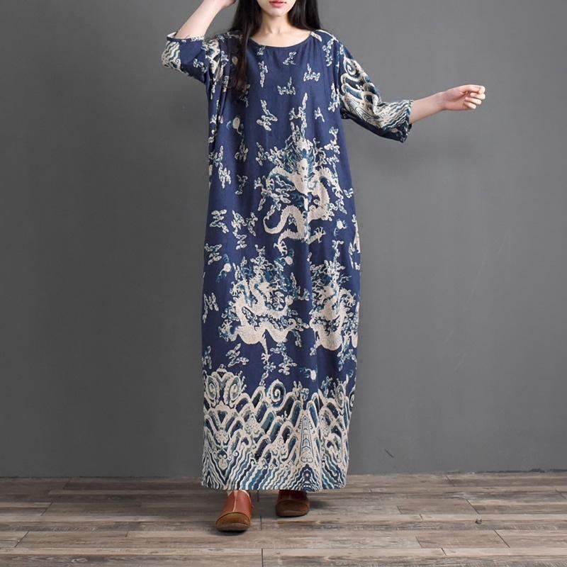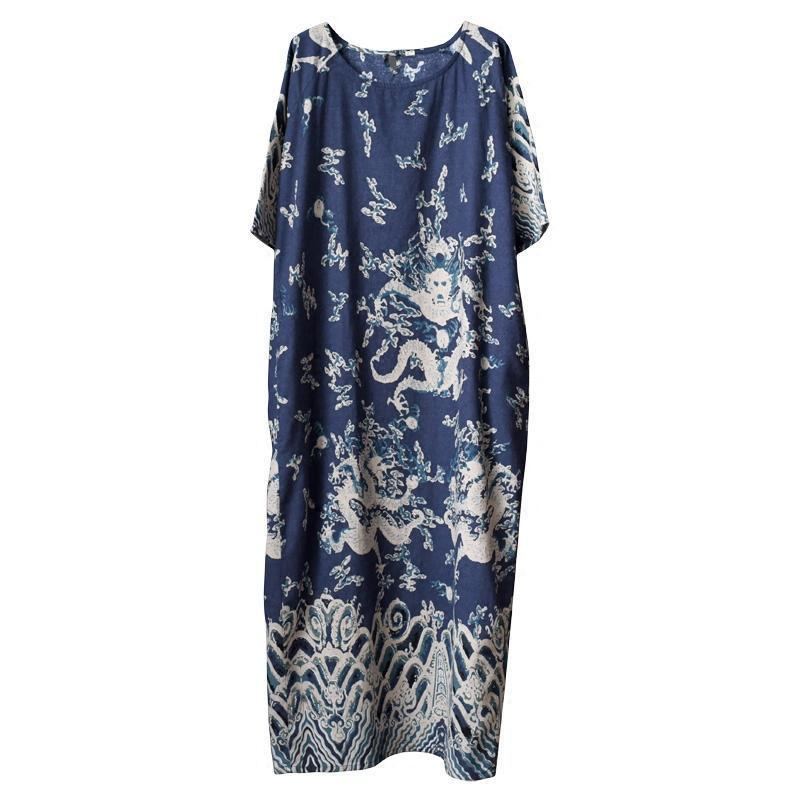 Sommar Dam Retro Etnisk Bomull Linne Lös Klänning