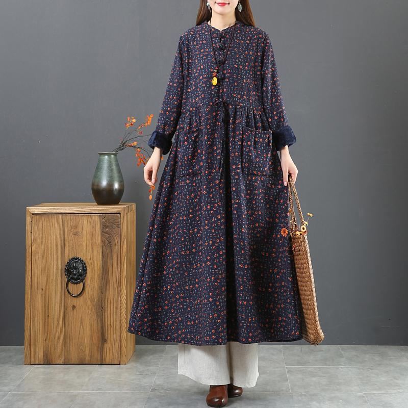 Retroklänning i bomull och linne för kvinnor. Långärmad blommig klänning i etnisk stil. Material av 90% bomull och linne. A-linjeformad kjol. Plus sammetsfoder, mjukt och bekvämt för vinterkollektionen. Ståkrage med vintage spännedesign, två tredimensionella fickor på båda sidor. Midjan på kjolen kan justeras när som helst med dragsko i midjan. tryckmönster preferens vintage inspiration.